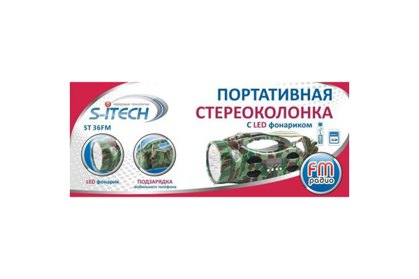 Портативная стереоколонка ST-36FM с радиоприемником, предназначена для воспроизведения звука с мобильных телефонов, MP3/MP4 плееров, PSP, iPod, ноутбуков, карт памяти SD/MMS, USB накопителей и других портативных устройств.