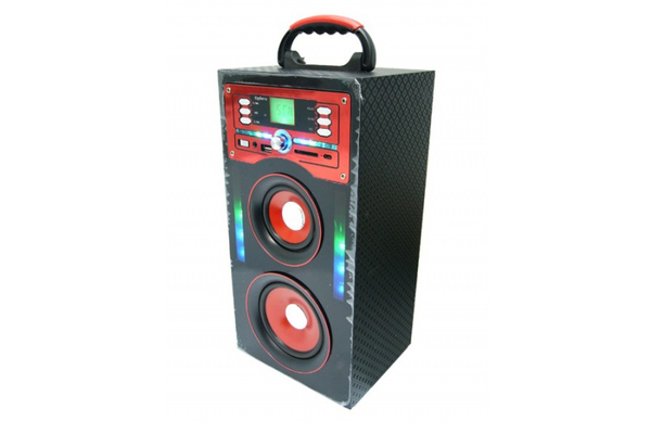 2 динамика 5˝ и 3" по 5W, FM, USB (до 16Гб), SD (до 16Гб), AUX , 2 входа под микрофоны(6,3мм), Синяя подсветка, Питание от встроенного аккумулятора (1200 mA) , аккумулятора BL-5C (в комплект не входит), либо 3*АА. Зарядка micro USB - DC5V, В комплекте: Пульт ДУ, кабель AUX, кабель miniUSB для зарядки, инструкция. Материал: дерево / пластик, Размер: 36*16,5*14 см