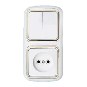Блок розетка+выключатель двухклавишный С/У, Б/З, бел/зол, 2В-РЦ-535, Bylectrica, Гармония, Беларусь