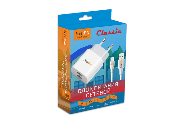 СЗУ на 2 USB FaisON FS-Z-465 Classic (3100mA) + кабель microUSB, белый