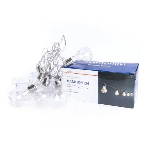 Гирлянда "Лампочки" светодиодная 3м, 60LED, 10 ламп, тёплый белый, прозрачный шнур 0,5м, 3*AA Funray