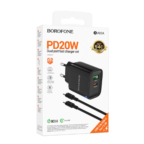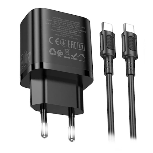 СЗУ на PD (гнездо Type-C) + USB BOROFONE BA83A, PD20ВТ, QC3.0A + кабель Type-C-Type-C, чёрный