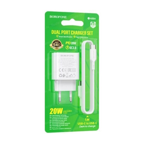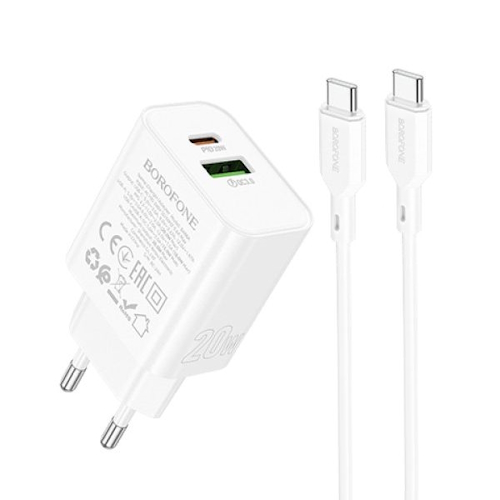 СЗУ на PD (гнездо Type-C) + USB BOROFONE BA88A, PD20ВТ, QC3.0A + кабель Type-C-Type-C, белый