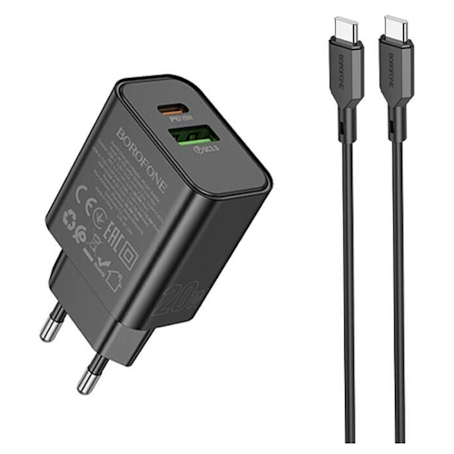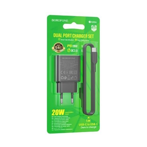 СЗУ на PD (гнездо Type-C) + USB BOROFONE BA88A, PD20ВТ, QC3.0A + кабель Type-C-Type-C, черный