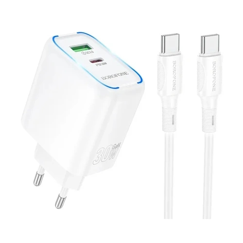 СЗУ на PD (гнездо Type-C) + USB BOROFONE BA89A, PD30ВТ, QC3.0A + кабель Type-C-Type-C, белый