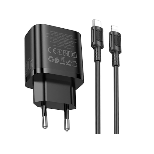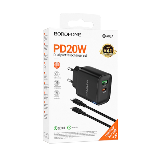 СЗУ на PD (гнездо Type-C) + USB BOROFONE BA83A, PD20ВТ, QC3.0A + кабель Type-C-Lightning, чёрный