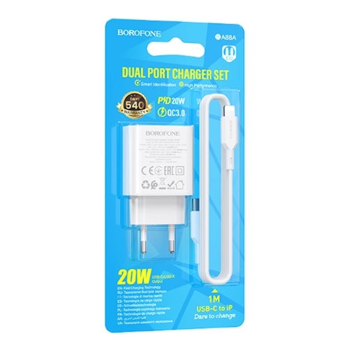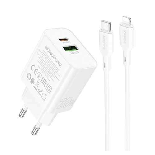 СЗУ на PD (гнездо Type-C) + USB BOROFONE BA88A, PD20ВТ, QC3.0A + кабель Type-C-Lightning, белый