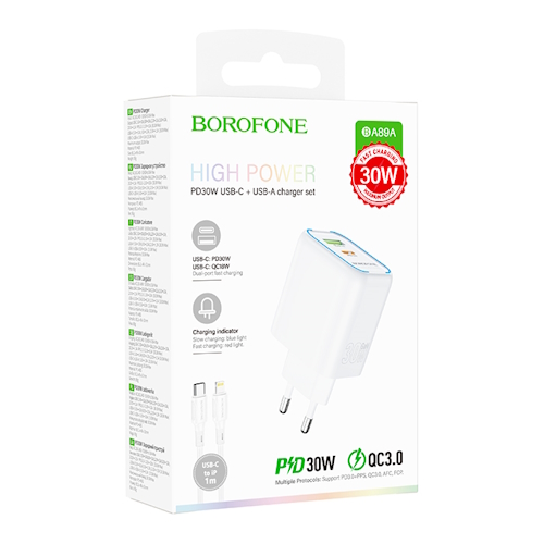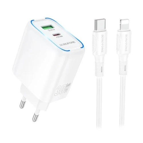 СЗУ на PD (гнездо Type-C) + USB BOROFONE BA89A, PD30ВТ, QC3.0A + кабель Type-C-Lightning, белый
