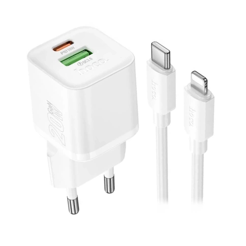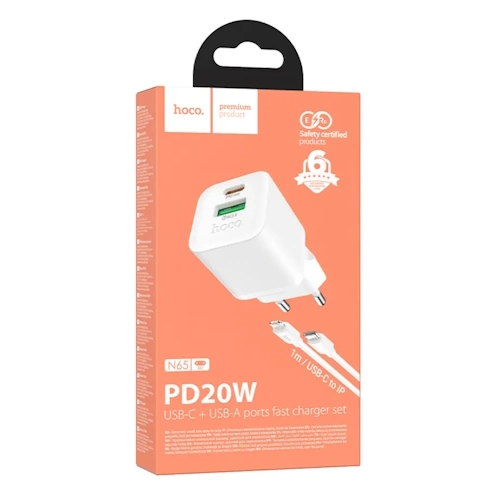 СЗУ на PD (гнездо Type-C) + USB HOCO N65, PD20ВТ, QC3.0A + кабель Type-C-Lightning, белый