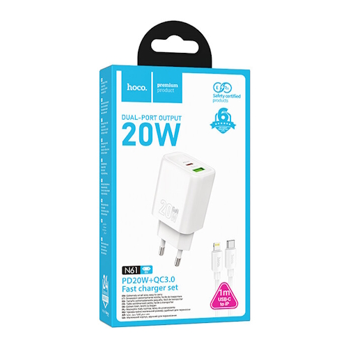 СЗУ на PD+USB HOCO N61 QC3.0, PD20Вт + кабель Type-C- Lightning белый