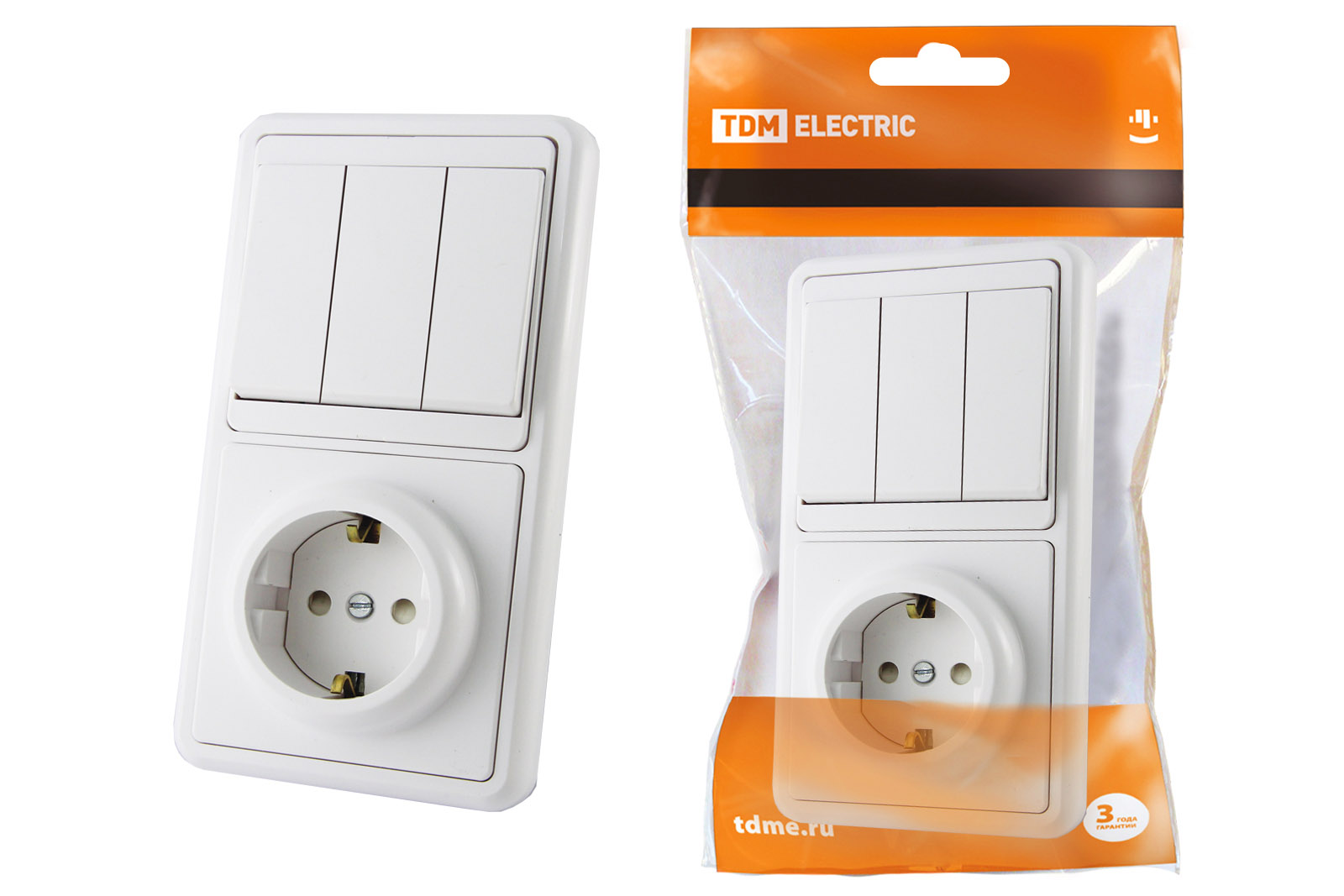 Блок вертикальный розетка+выключатель 3-клавишный белый c/у, с/з, з/ш БКВР TDM