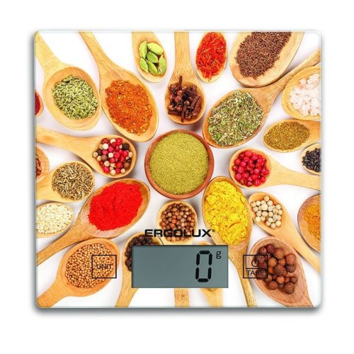 Весы кухонные электронные Ergolux ELX-SK01-C11 Яркие приправы, до 5 кг,15*15см, ЖК дисплей, 1х CR2032 1872