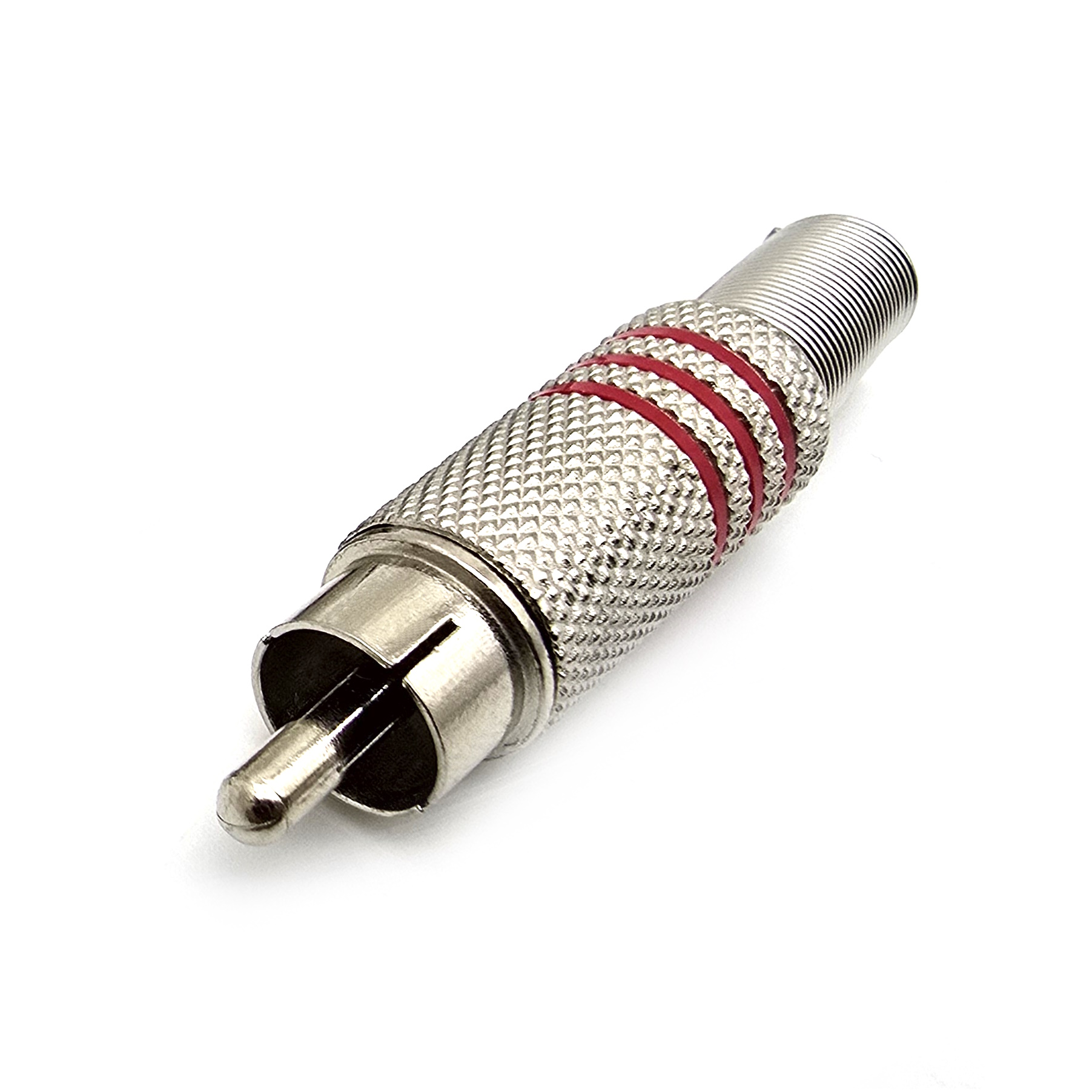 Штекер RCA тюльпан металл, L=45мм, под винт, серебро, пружина антизалом, 3 кольца красные, D-7мм