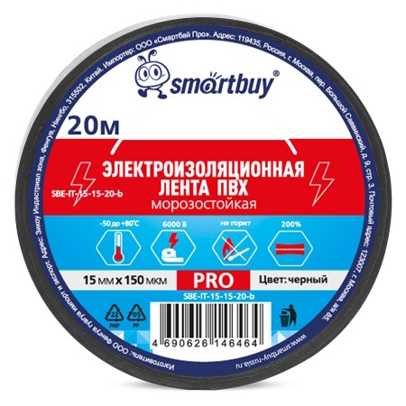 Изолента Smartbuy Pro, 0.15х15мм, 20 метров, чёрная морозостойкая (SBE-IT-15-15-20-b)