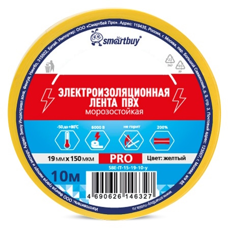 Изолента Smartbuy Pro, 0.15х19мм, 10 метров, жёлтая морозостойкая (SBE-IT-15-19-10-y)