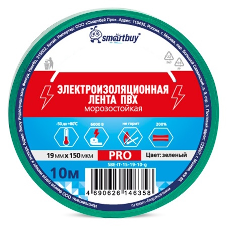 Изолента Smartbuy Pro, 0.15х19мм, 10 метров, зелёная морозостойкая (SBE-IT-15-19-10-g)