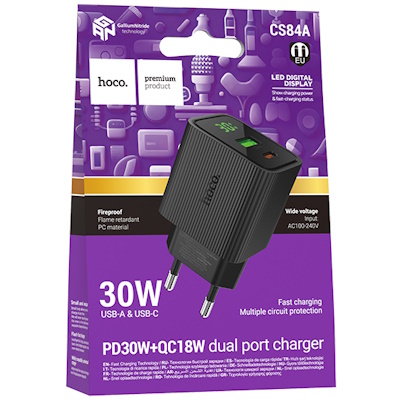 СЗУ на PD+ USB HOCO CS84A 3.0A PD 30W+QC3.0 быстрая зарядка с LED-дисплеем чёрный