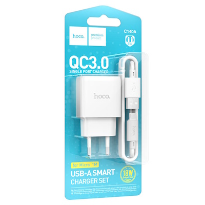 СЗУ на USB HOCO C140A Smart, QC3.0 + кабель USB- Micro USB белый